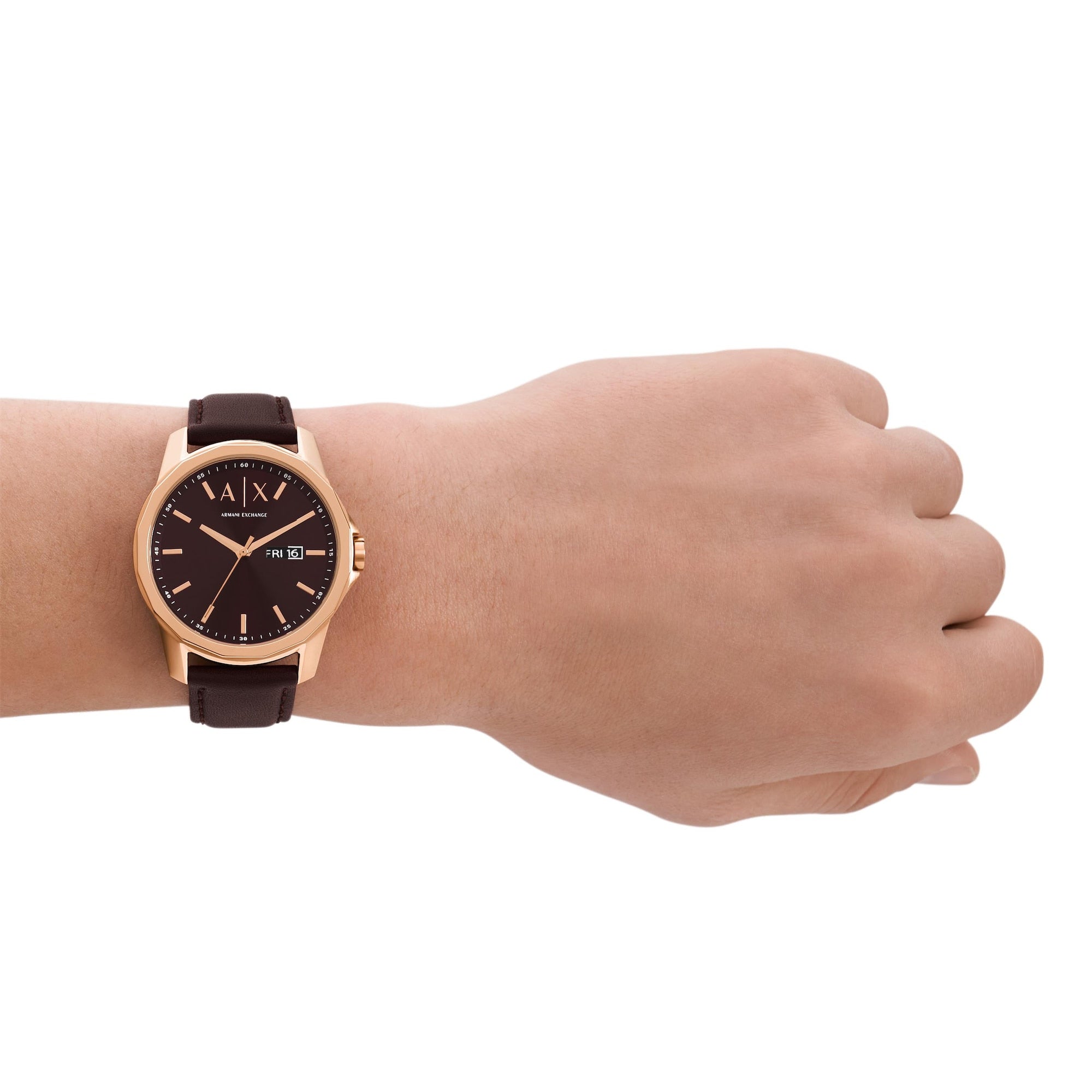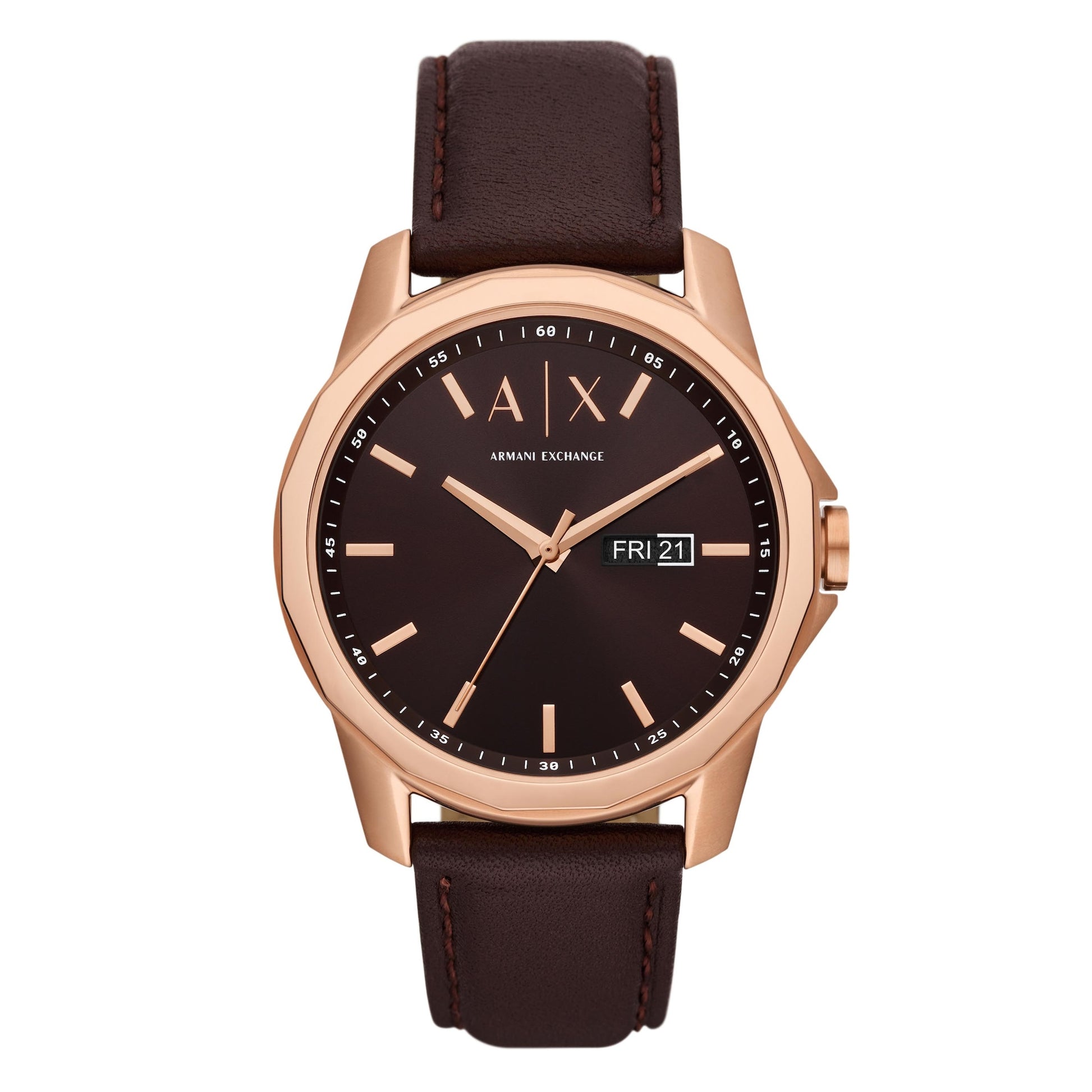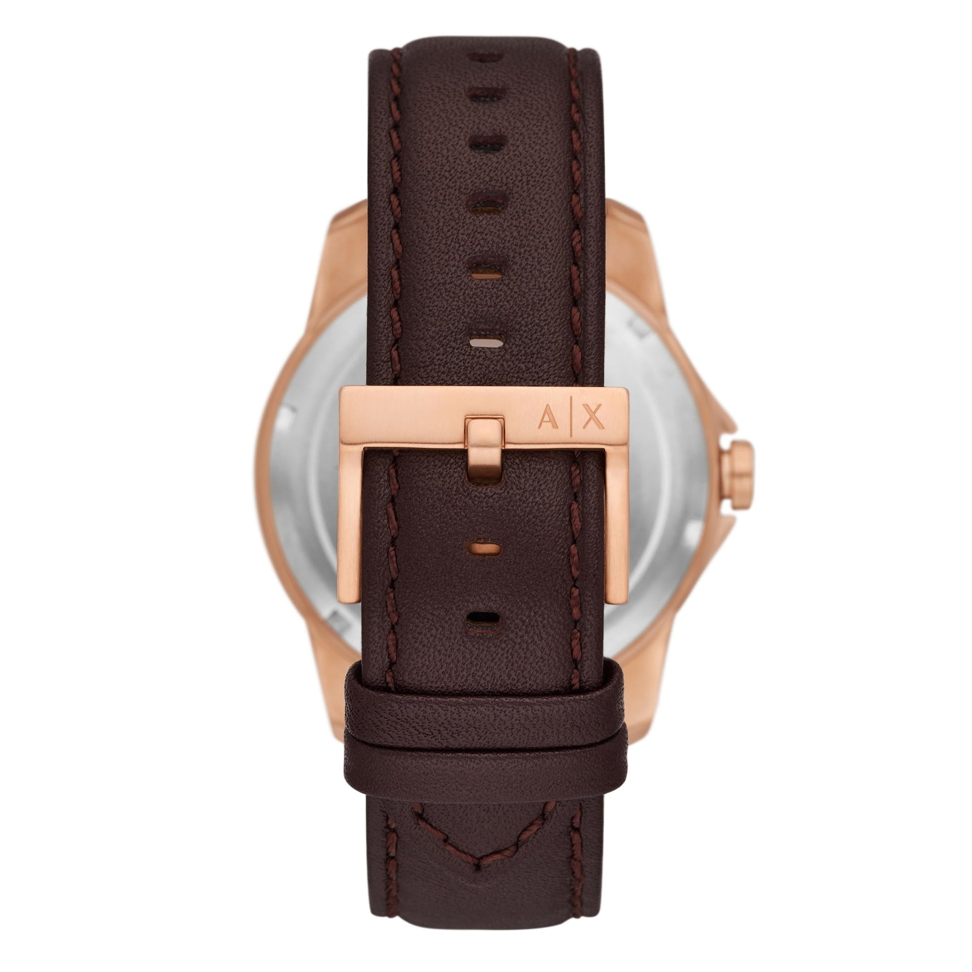 Upgrade your outfit with this stylish Armani Exchange watch. Crafted from rose gold-tone stainless steel, this 46mm timepiece is adorned with a date feature and a comfortable brown leather strap, it's perfect for those who appreciate refinement. As a gift, it's bound to leave a lasting impression and put a grin on his face.
