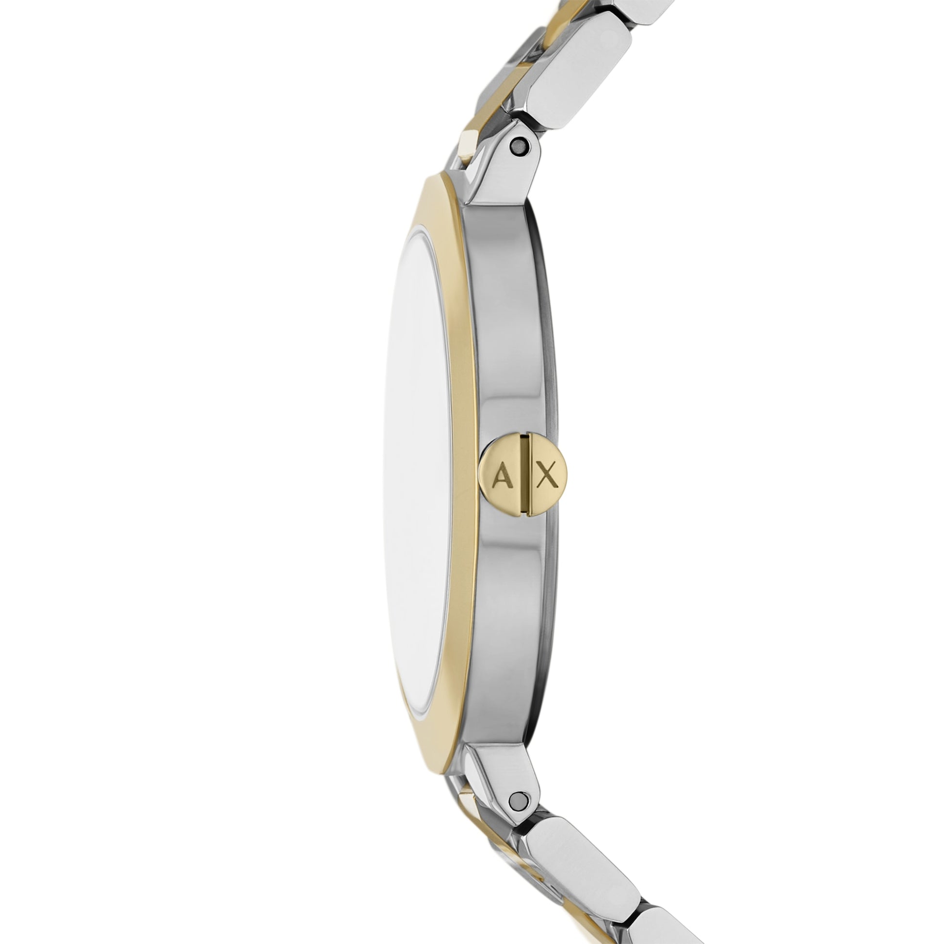 Armani Exchange's 36mm two tone stainless steel watch features a captivating green sunray dial and elegant two hand quartz movement. The combination of rose gold and silver tones on the bracelet adds a touch of sophistication, making this timepiece a versatile accessory for any occasion. The mineral crystal ensures durability, while the classic round case shape exudes timeless style.