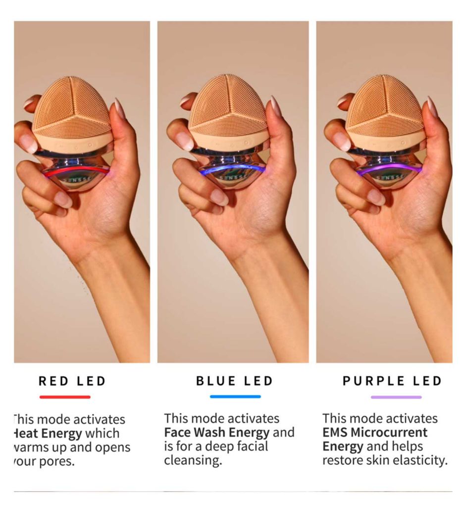 The device boasts 3 LED modes ( blue ,red + purple) helping to address differing skin concerns. RED LED is HEAT ENERGY mode. This warms up the device which helps open pores and produces more collagen. It’s the best setting for anti-aging. BLUE LED is FACEWASH ENERGY. This mode is for deep skin exfoliation and facial cleansing.