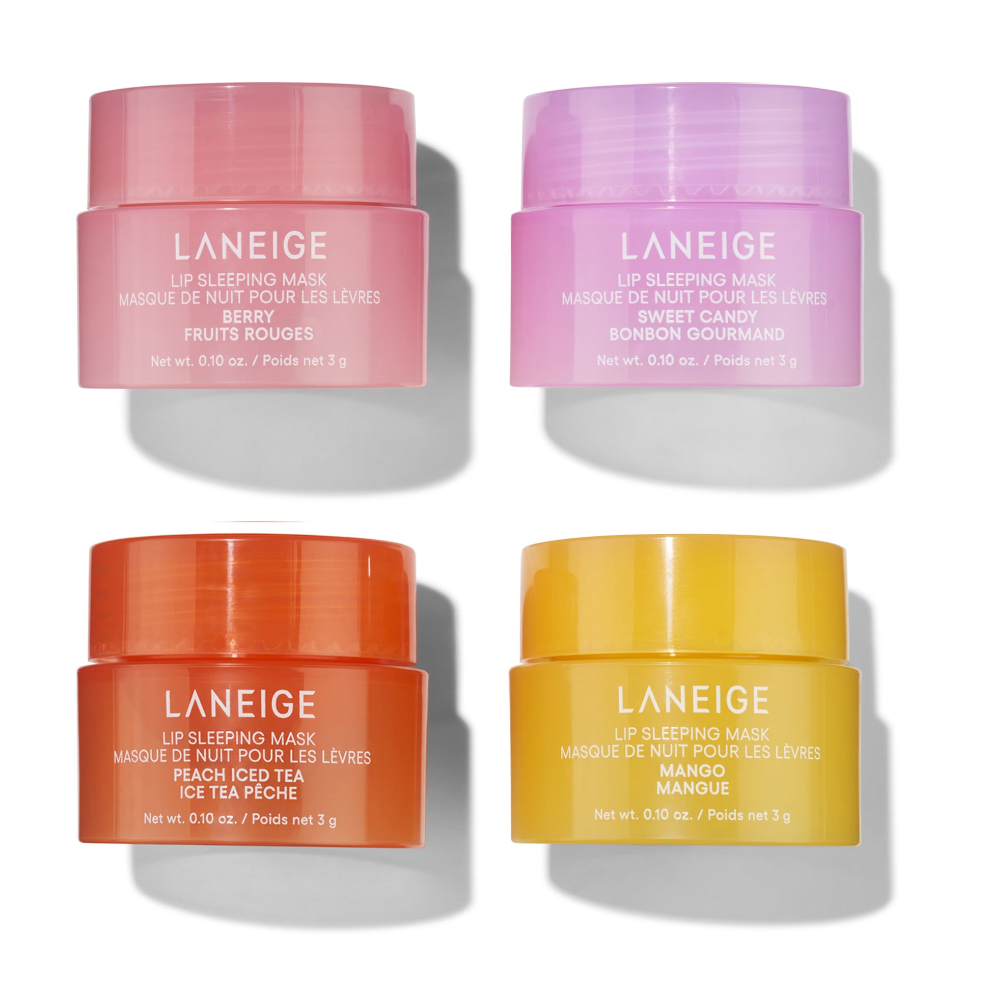 This set delivers indulgent lip care in mouth-watering flavours - Berry, Mango, Sweet Candy, and Peach Iced Tea. Each mask is formulated with Laneige’s signature berry fruit complex, a blend of pomegranate, grape, and raspberry juices that condition and help keep lips smooth, healthy, and free from flaking or cracking.