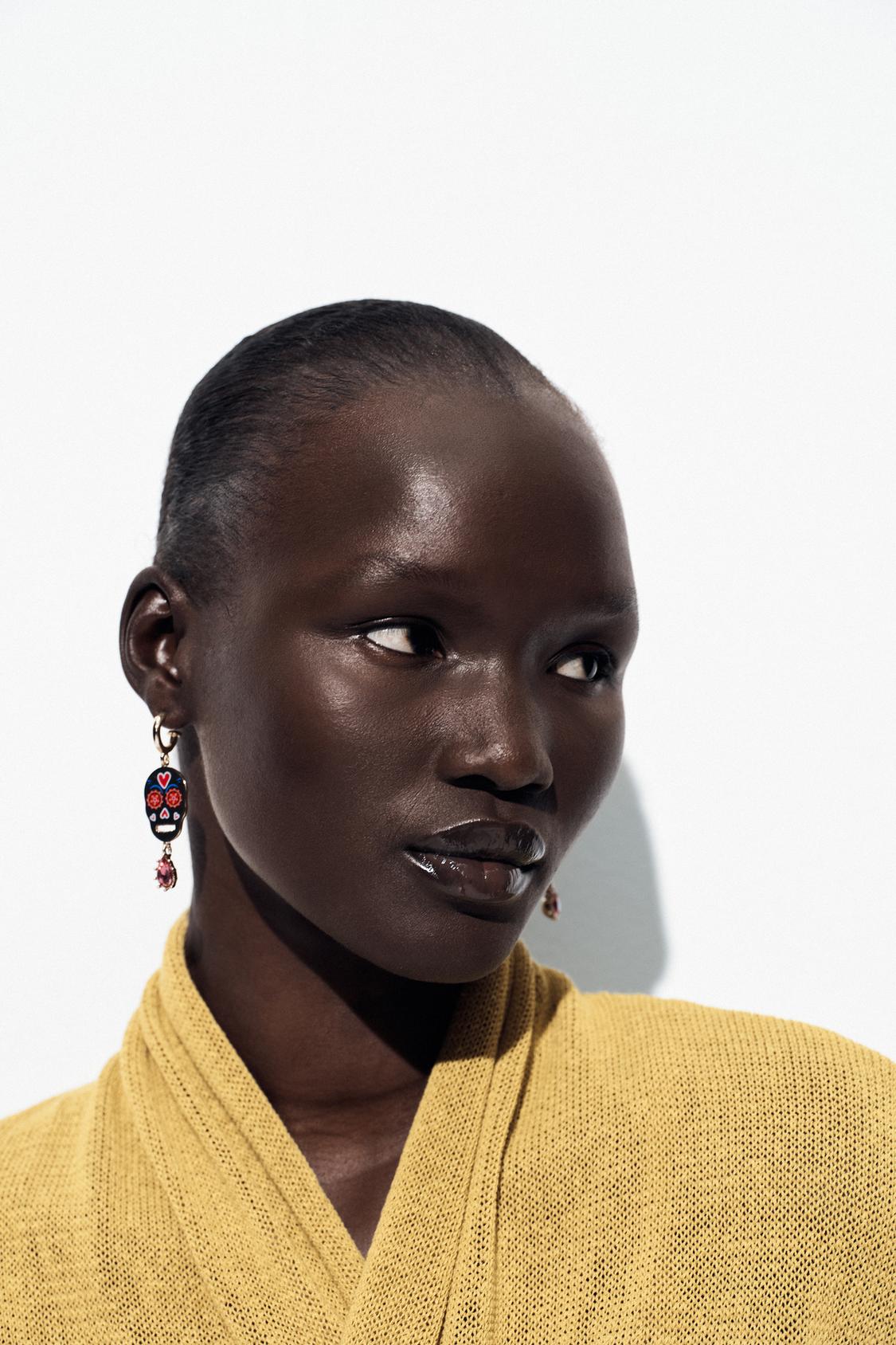 Embossed metal hoop earrings. Featuring an enamelled skull pendant and embedded gem appliqué. Push-back closure.