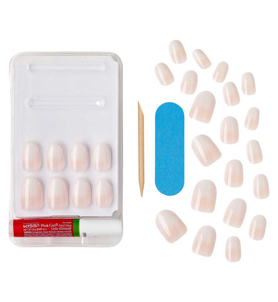 Nail kit contains 28 fake nails, pink gel nail glue (2g), mini nail file, & manicure stick