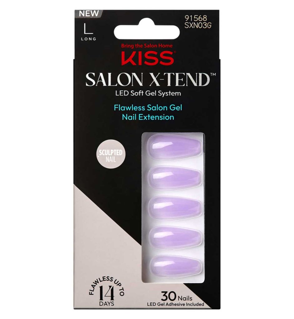 KISS Salon X-tend LED Soft Gel System Color Nails, Solid Lavender, Long Coffin, 34 Ct.