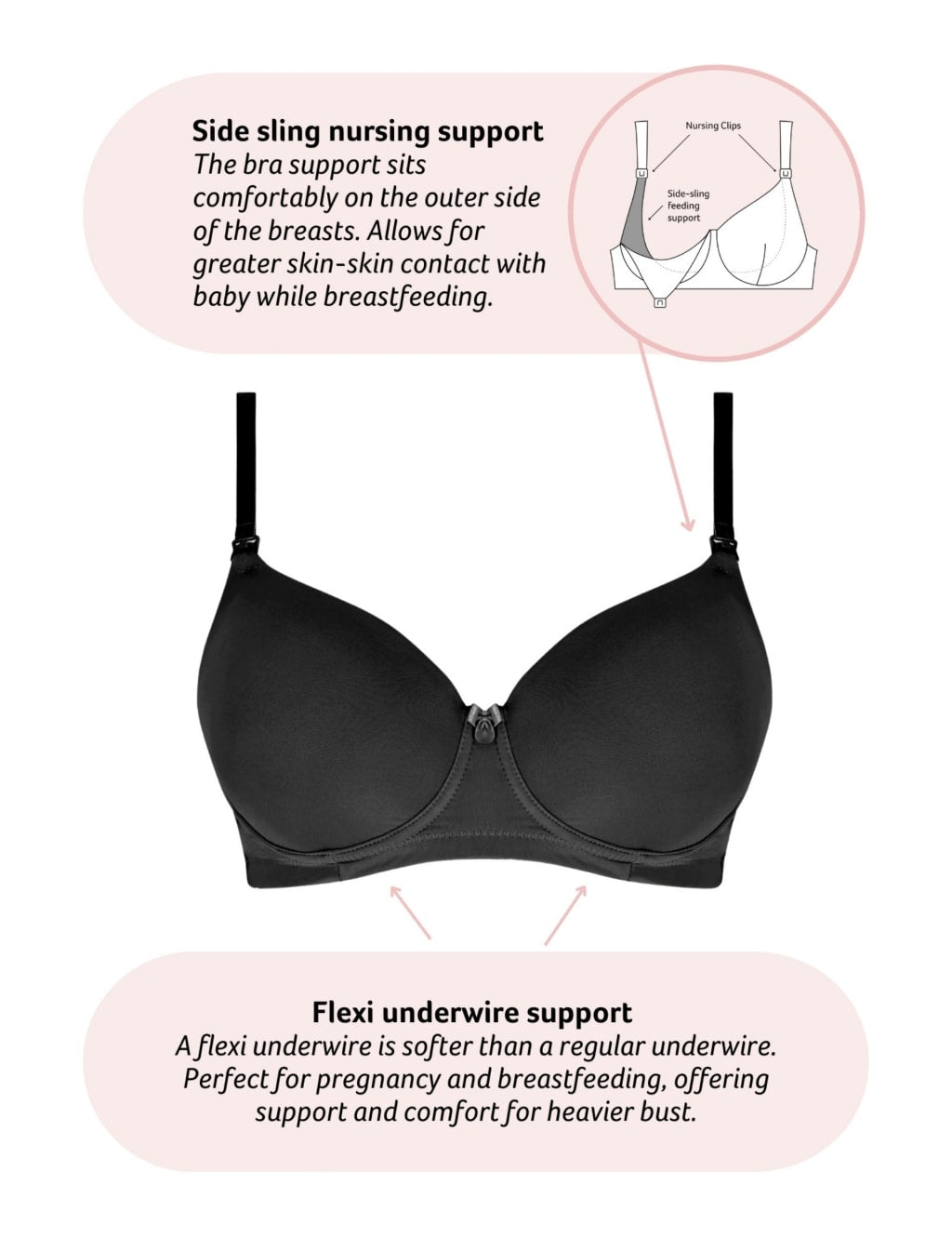The Forever Yours maternity nursing bra from Hotmilk is a t-shirt style. It features a flexible underwire for softer support, and padded cups for a smooth look. The multiway straps can be crossed over at the back. Side sling feeding support gives greater skin-on-skin contact when nursing your baby.