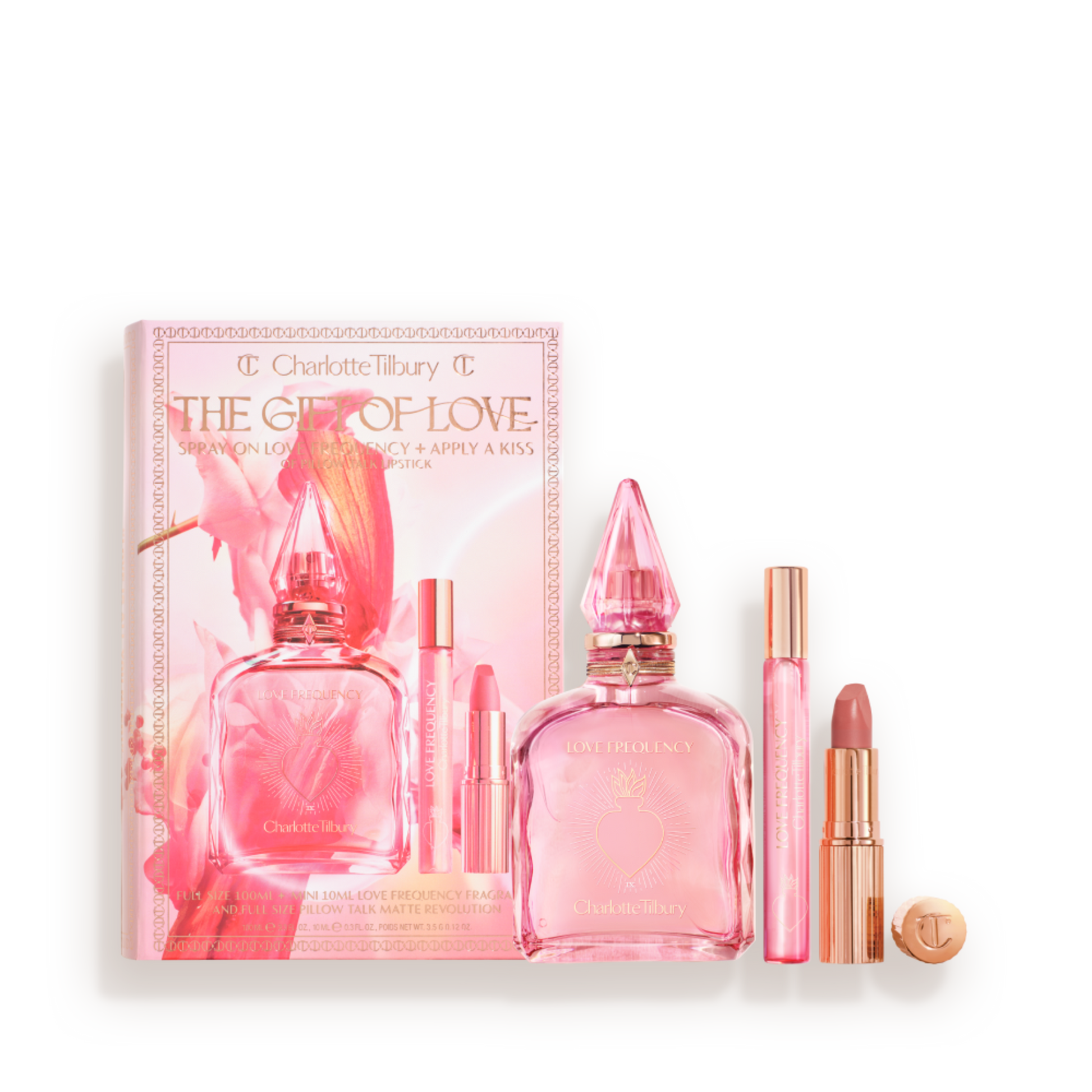 This kit includes a full-sized Pillow Talk Lipstick for loveable, nude-pink lips, a full-sized Love Frequency perfume to spray on a magic love aura, and a travel-sized Love Frequency perfume for an on-the-go love rush.