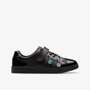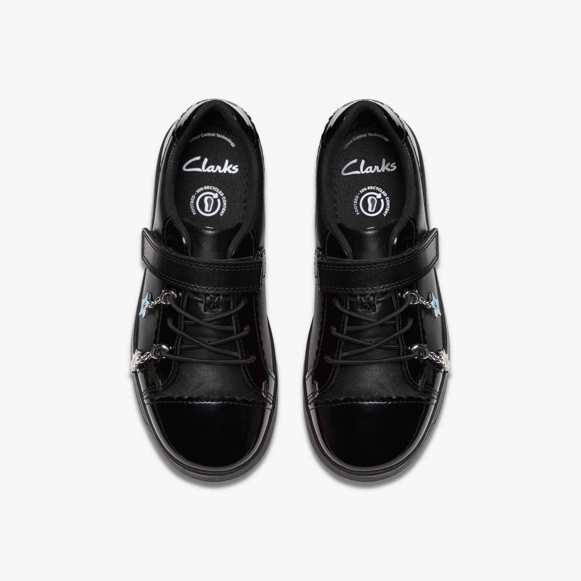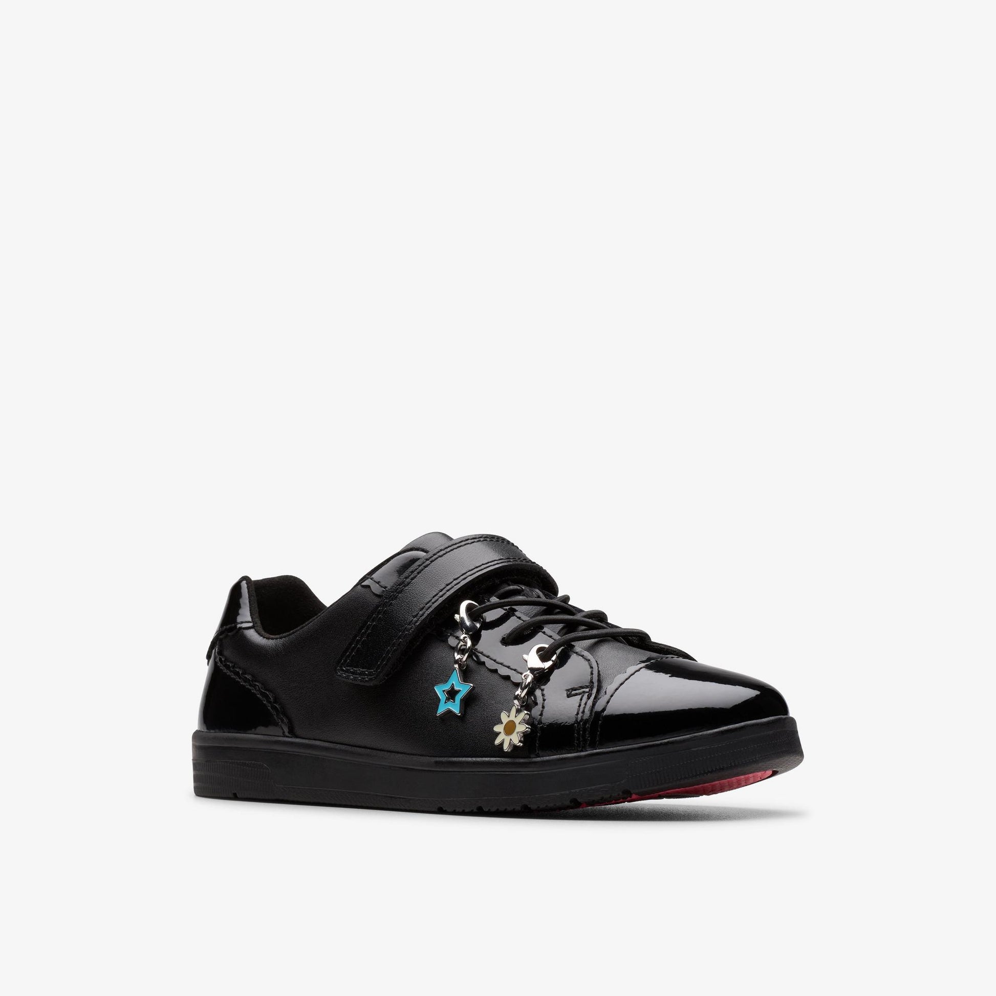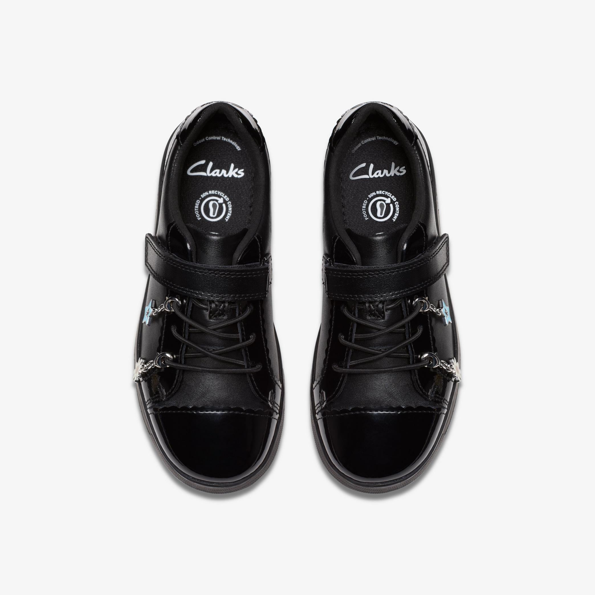 Durable black leather upper with scalloping details, patent leather trims and removable charms