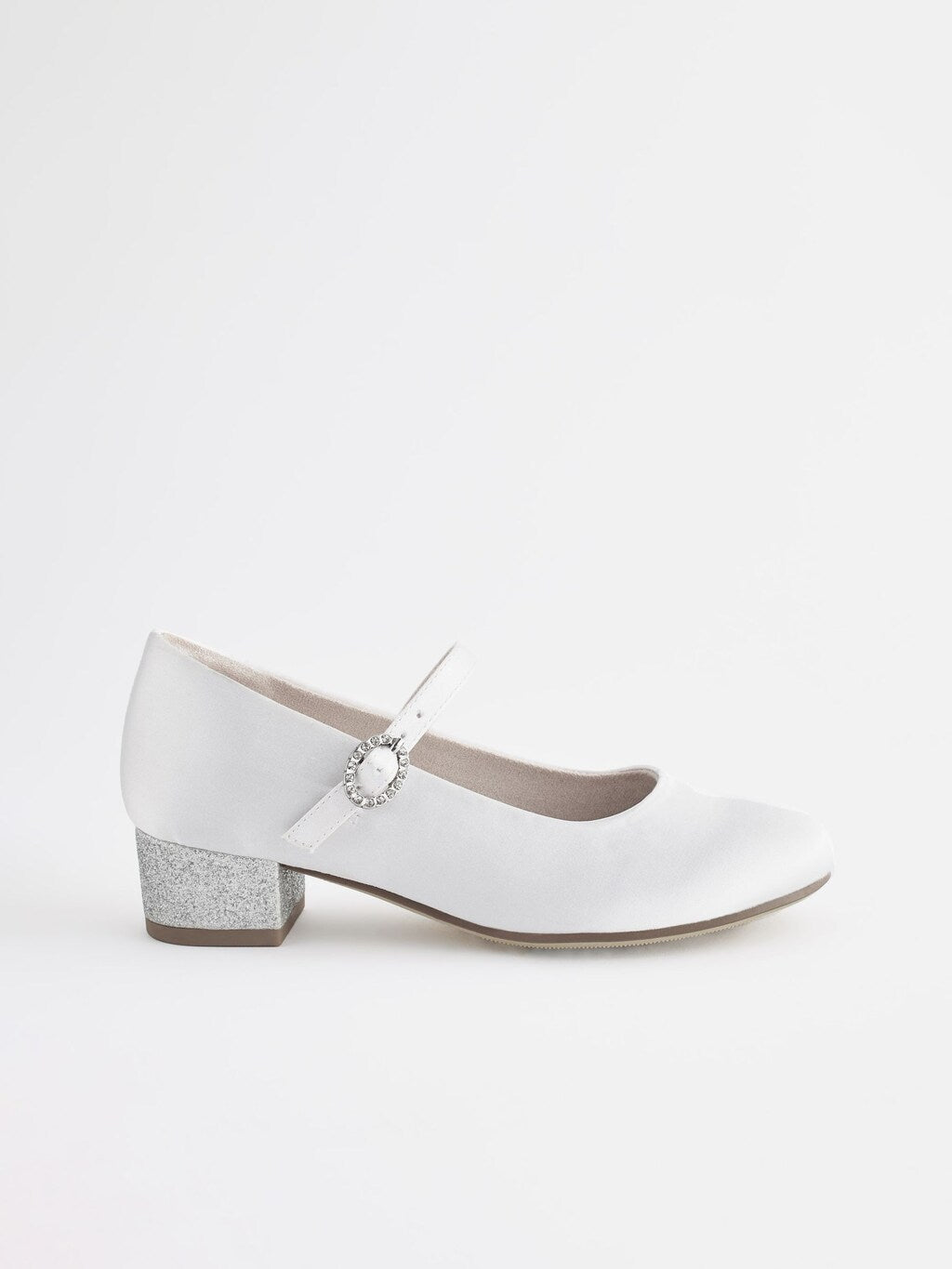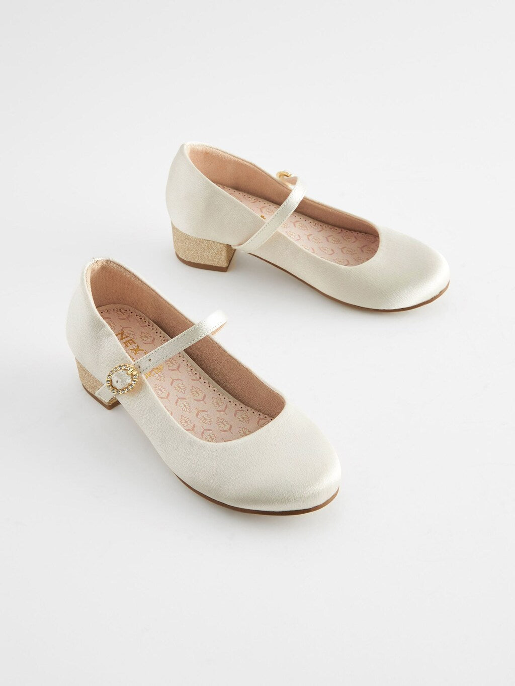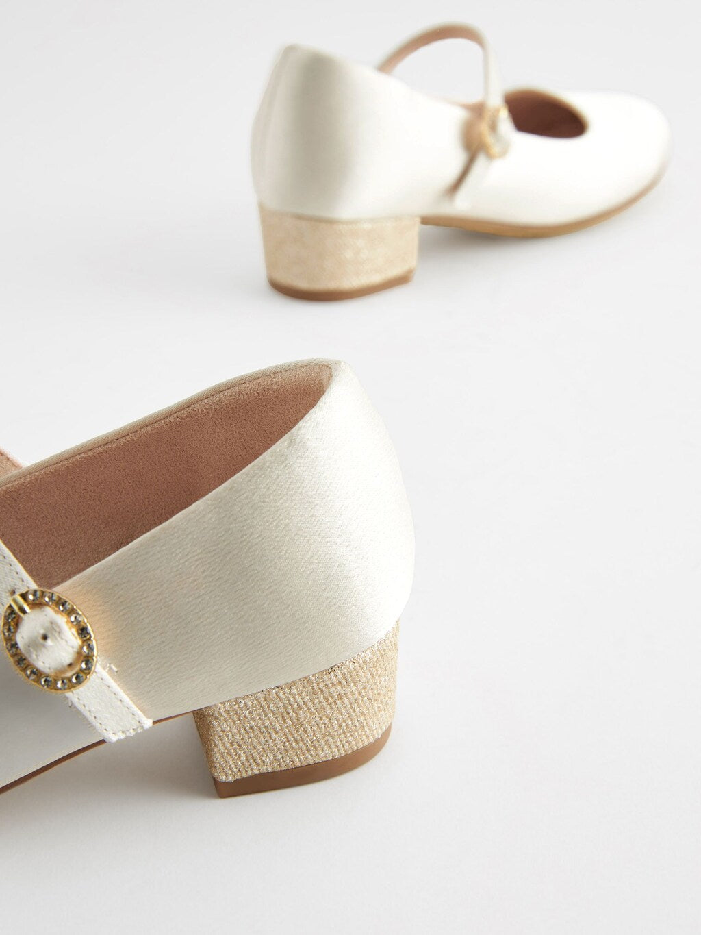 Complete her party outfit with these adorable ivory shoes. The classic Mary-Jane in stain-resistant satin also features a cute chunky block heel that has a dazzling glitter finish and a fully adjustable buckled strap for a secure fit.