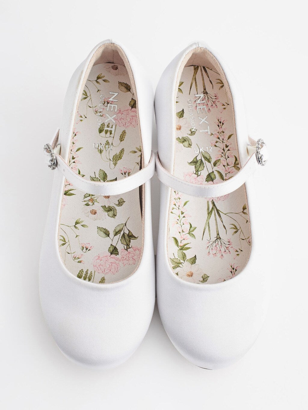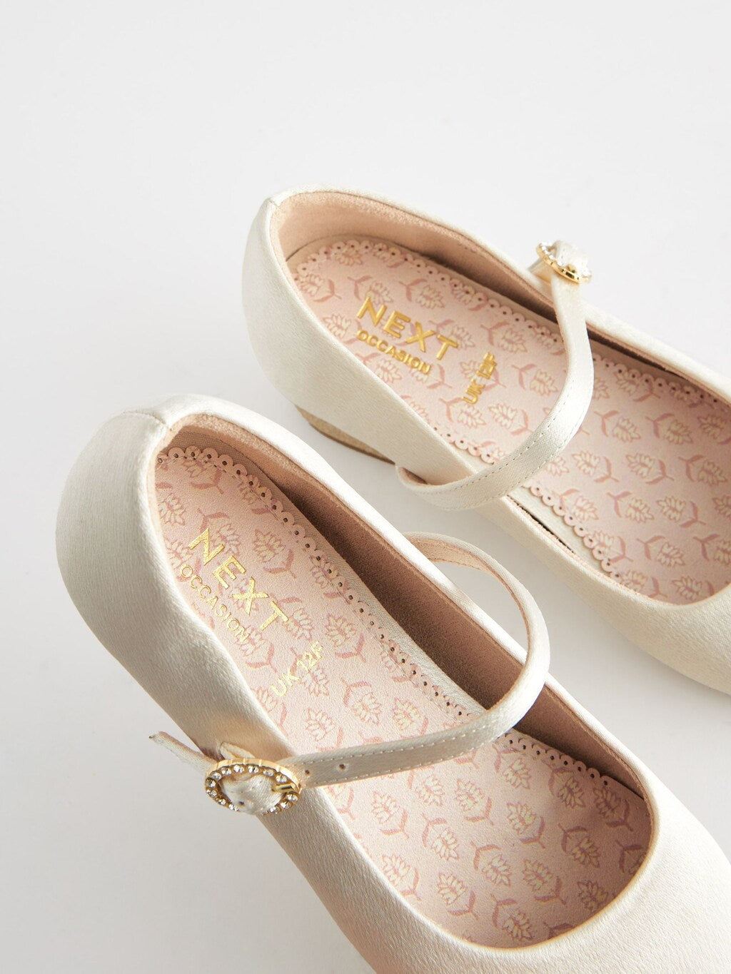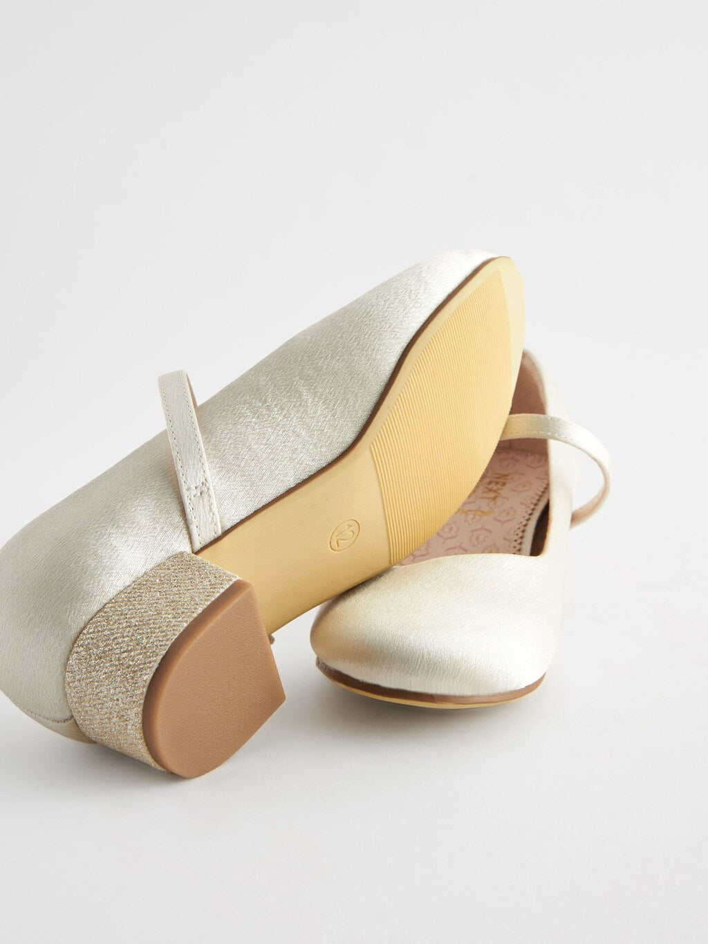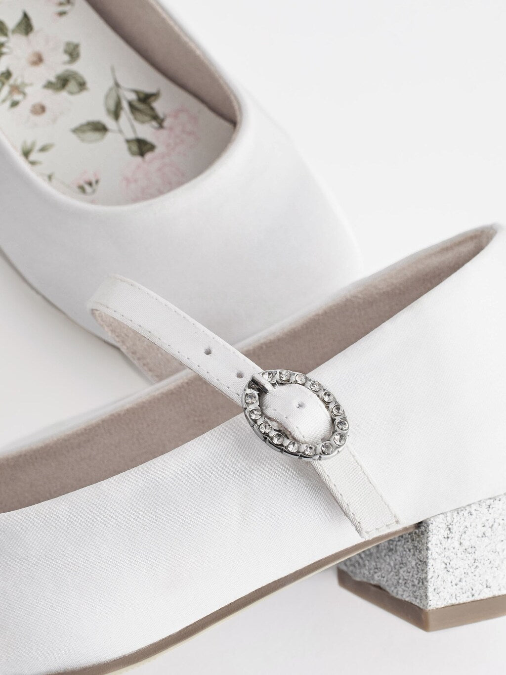 Complete her party outfit with these adorable ivory shoes. The classic Mary-Jane in stain-resistant satin also features a cute chunky block heel that has a dazzling glitter finish and a fully adjustable buckled strap for a secure fit.