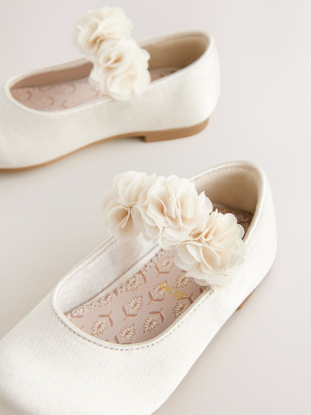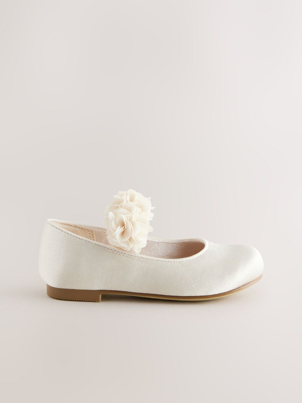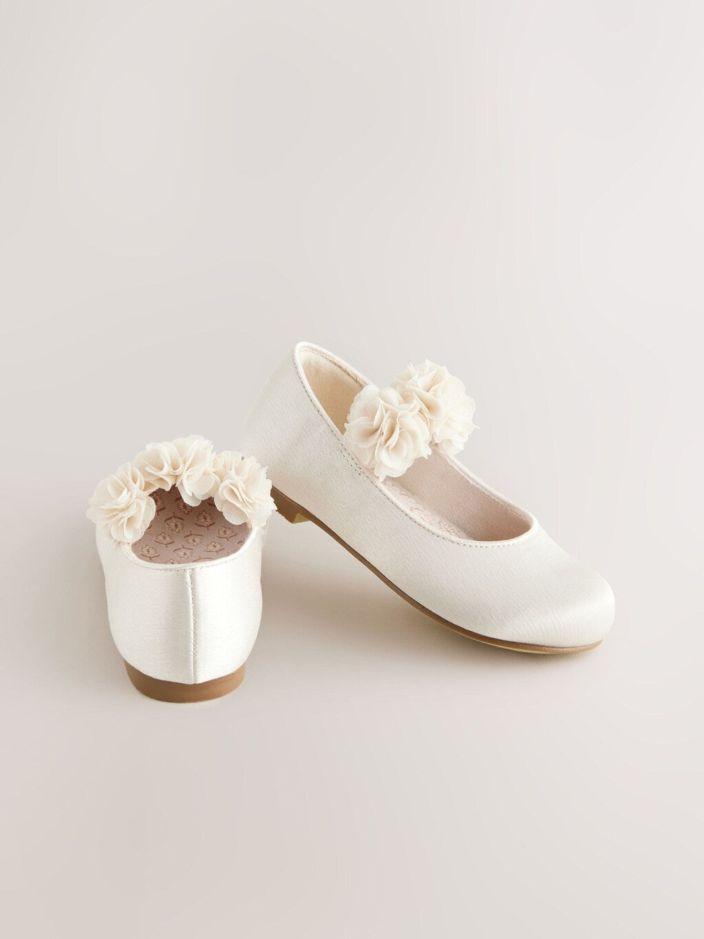 A tasteful finishing touch for wedding outfits, these gorgeous ivory white Mary Jane shoes have a smooth satin upper with corsage detailing to the elasticated strap, finished with a textile lining and a durable slip outsole.