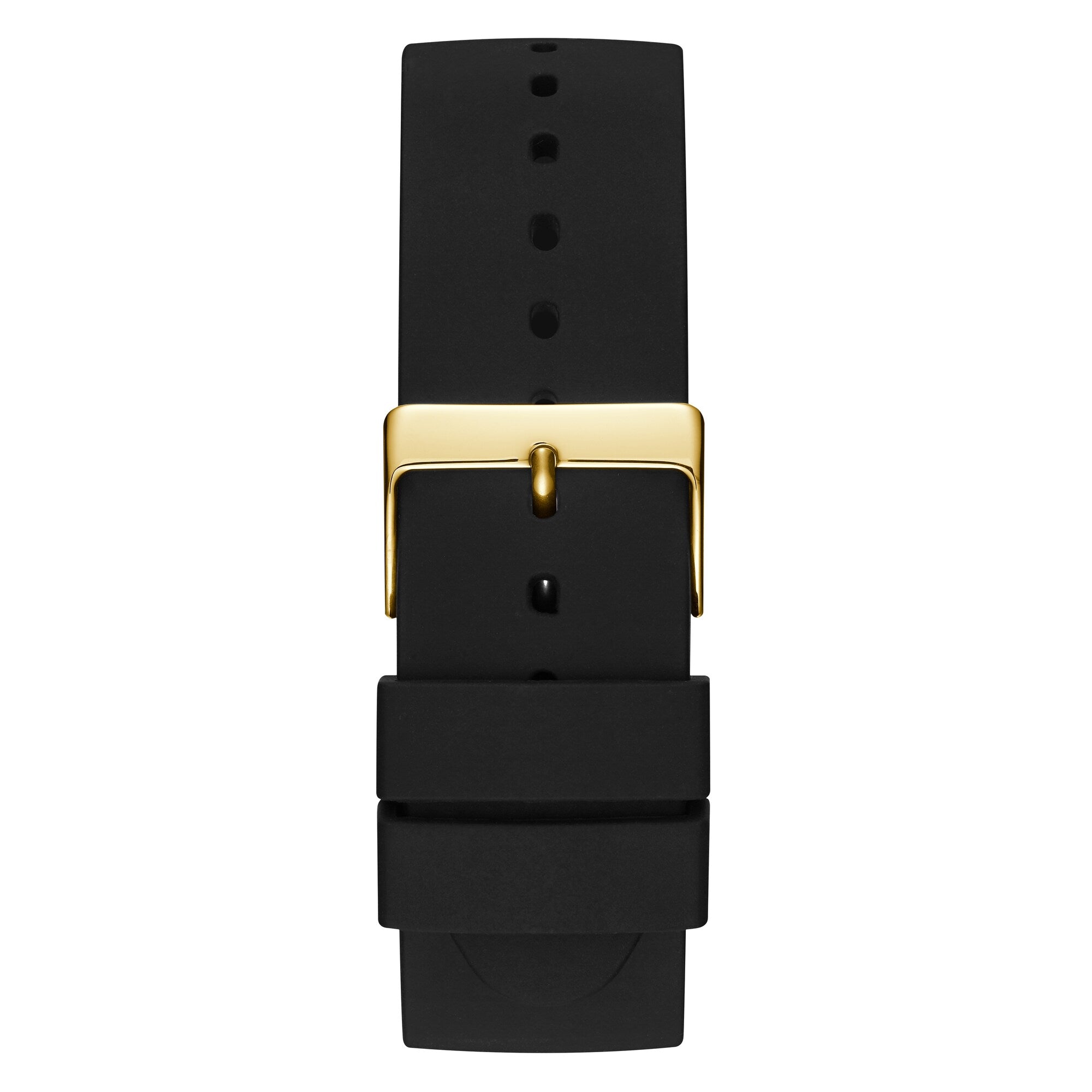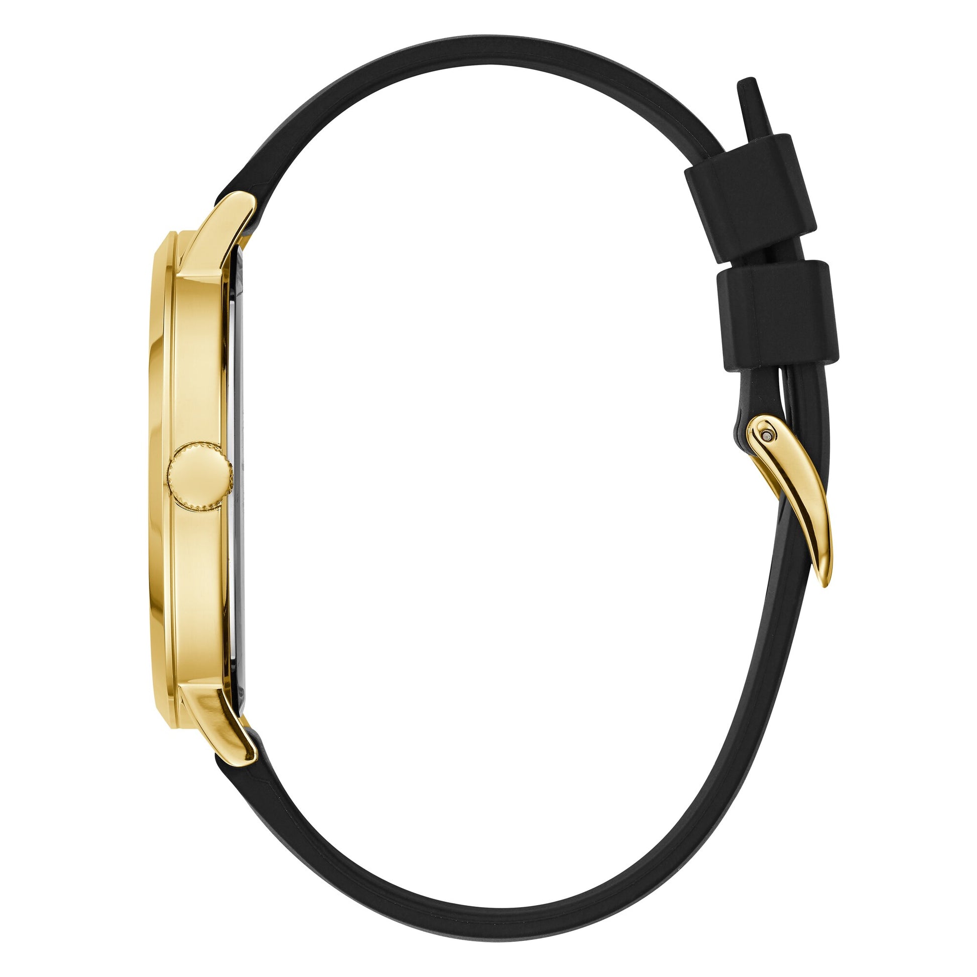 Guess men's watch with a polished gold tone case, sunray black stud logo dial with a black smooth silicone strap.