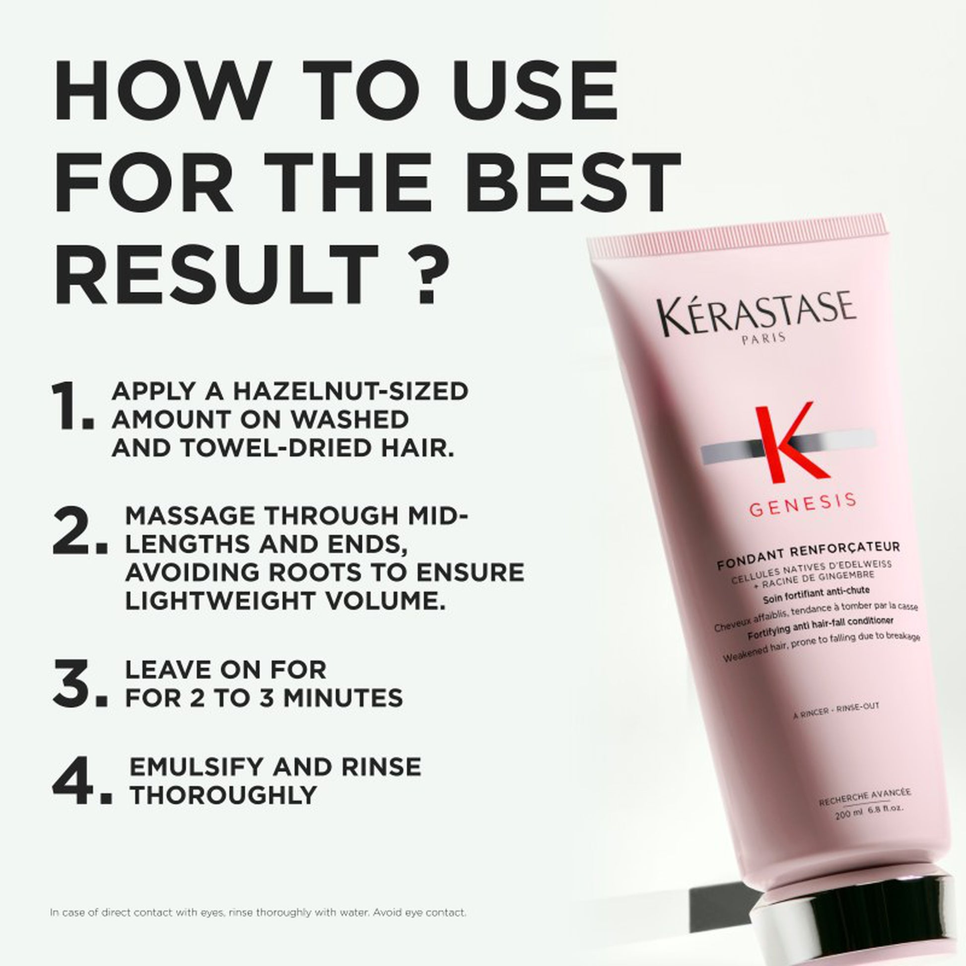 Fortifying anti hair-fall conditioner for weakened hair, prone to falling due to breakage. Enriched with Edelweiss Native Cells, Ginger Root & Aquaxyl the anti-breakage action helps reinforce the fibre's natural resistance to reduce the risk of hair fall due to breakage. Provides immediate feeling of strength and softness without weighing down the hair.