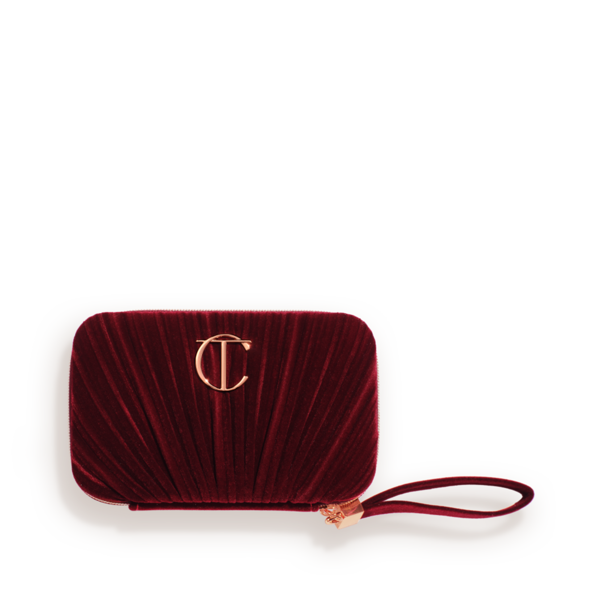- Giftable zip-around brush case in Night Crimson velvet with a wrist strap and mirror