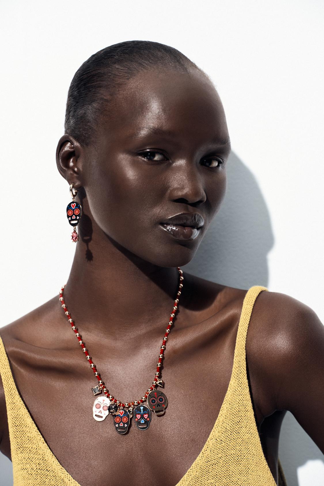 - Combined necklace with coloured beads. Pendants in the shape of enamelled skulls and charms in different shapes. Lobster clasp fastening.