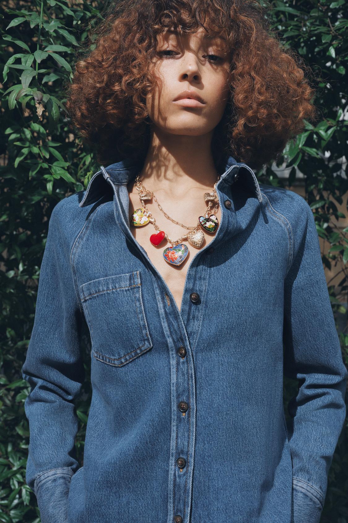 - Metal link necklace with heart pendants in different shapes, sizes and materials. Lobster clasp fastening.