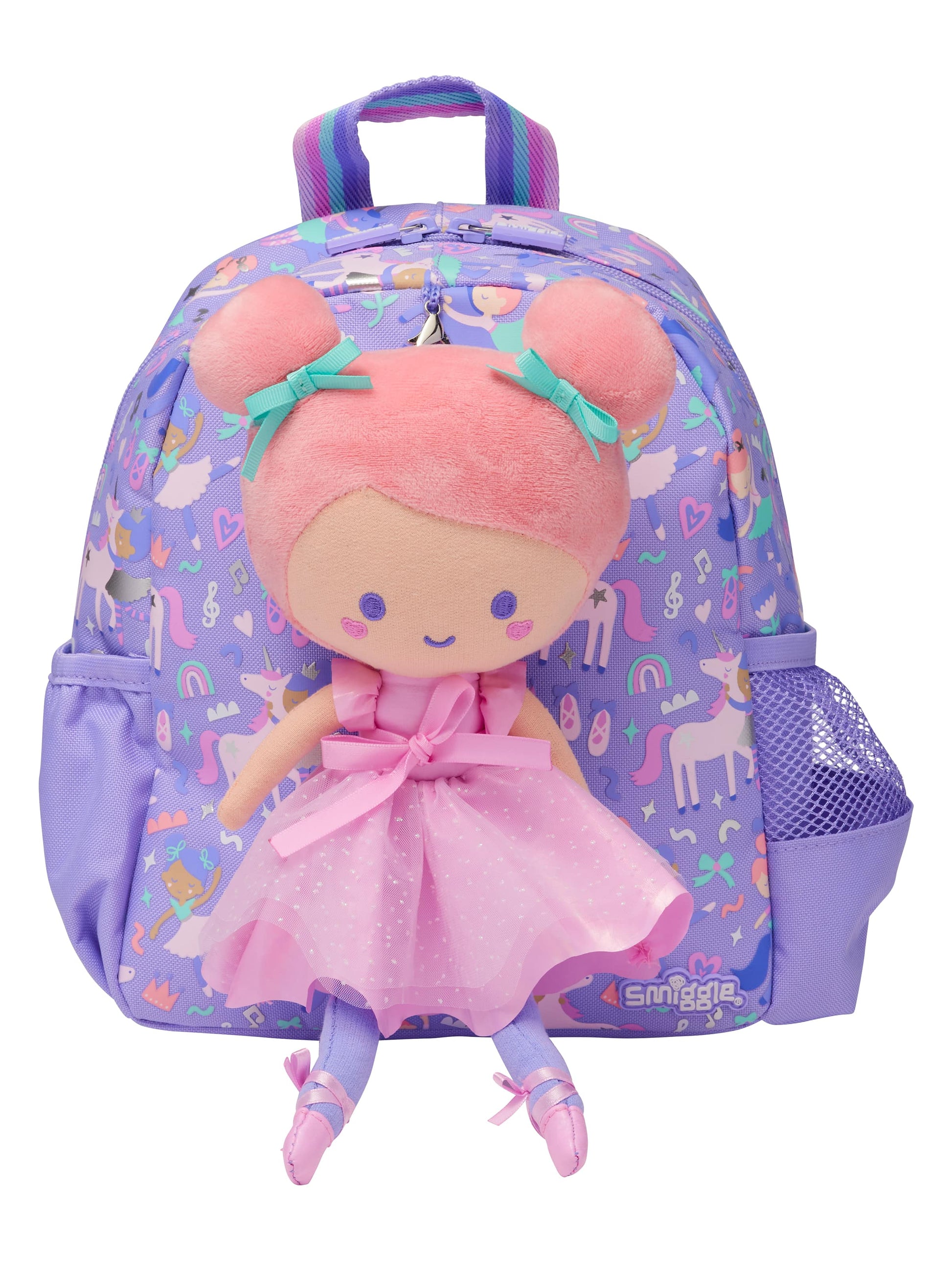 Bring an adorable ballerina friend along on all adventures with our Ready Set Go Teeny Tiny Backpack With Detachable Plush Toy! This backpack features a peach-scented plush doll, attached to the front with a lobster clasp and dainty ribbon details. Simply untie the plushie whenever your Smiggler needs a comforting cuddle! Plus, the backpack has a zipped main compartment and dual drink bottle sleeves for all essentials.
