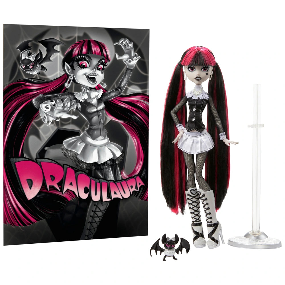 Dressed in a pleated skirt, black vest, and platform boots, she's joined by her batty BFF Count Fabulous and two vintage-style movie posters; one mini, one life-size. Fully poseable and packed with retro horror vibes, Draculaura is the star of any spooky scene!