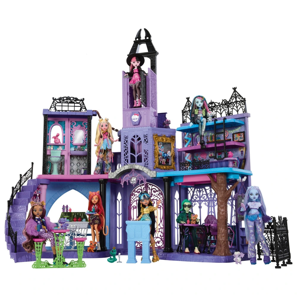 Monsters and mystery await at the Haunted High School playset! This screamium doll house features 360° play, multiple surprises, and 35+ storytelling pieces for bone-chilling adventures. Discover the chilling charms of Monster High via 7+ play areas including a creepateria, classroom, bathroom, and bedroom that sleeps up to 3 dolls (dolls sold separately). Surprises await! Swivel the staircase to reveal the hidden potion room, then find the 2 secret passageways for secret slide and trapdoor transformations.