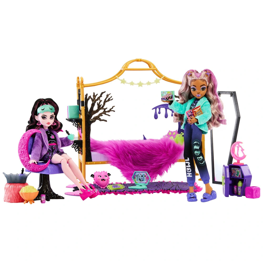 Contents: 1x Draculaura Doll, 1x Clawdeen Wolf Doll, Assorted Bedroom Furniture and Accessories