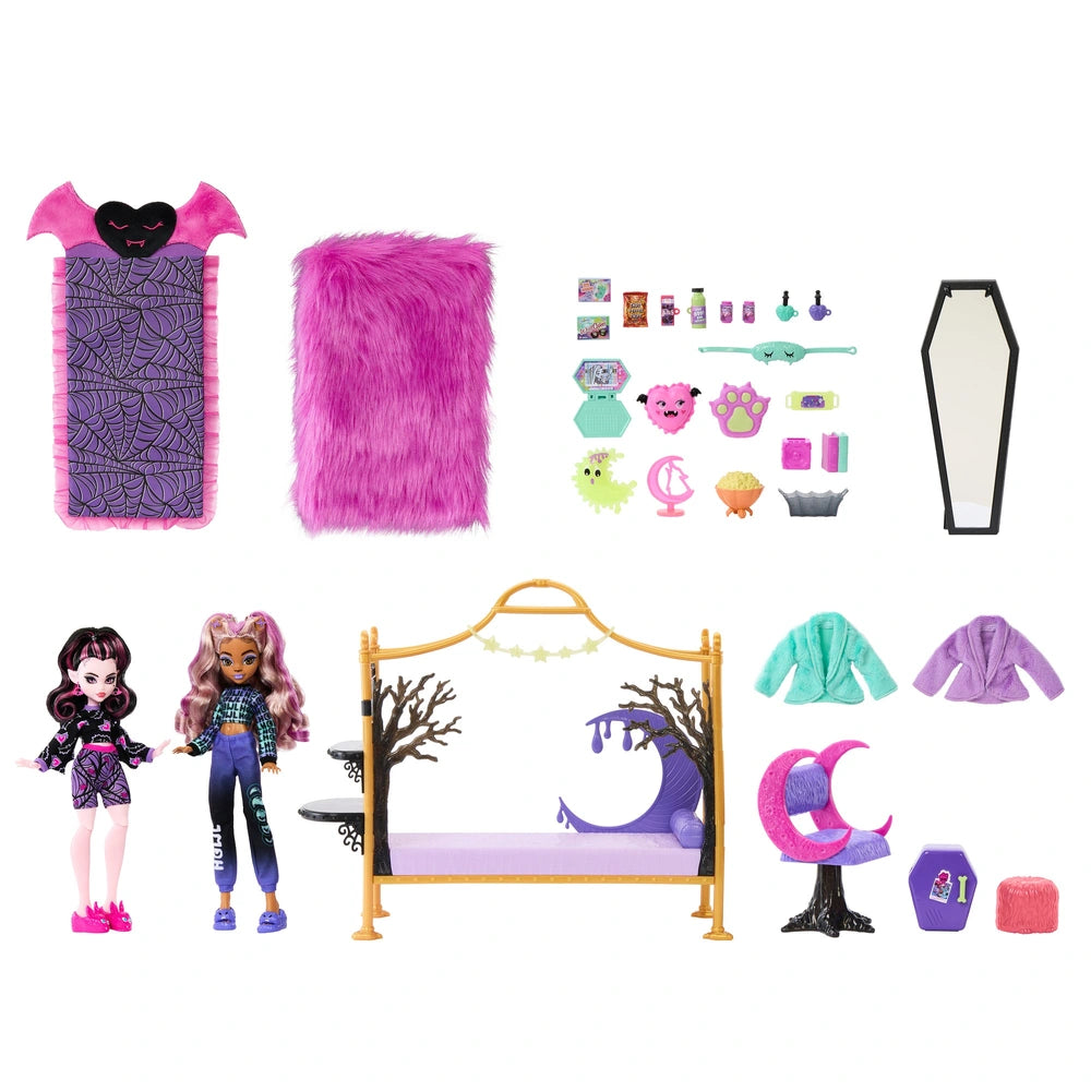 These two Monster High dolls are ready for a spooky creepover with this bedroom playset! Comfy-cosy fashions and 20+ themed storytelling pieces set the scene for a scary good time. Clawdeen Wolf doll has invited Draculaura doll over for a slumber party in her clawfully cool bedroom! A four-post bed and spiderweb-printed sleeping bag make the werewolf's den extra cosy. Each doll wears a comfy creepover look and comes with a fuzzy robe, slippers, and a creepy-cute pillow.