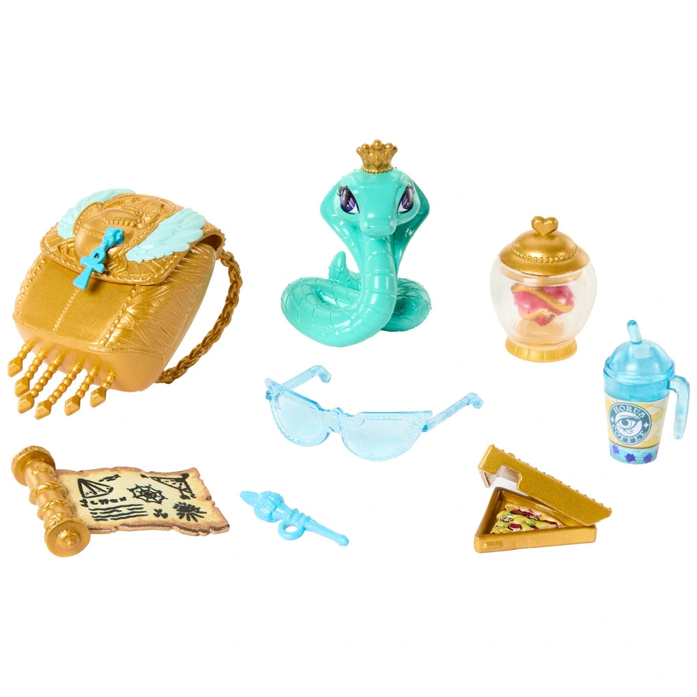 Contents: 1x Cleo De Nile Doll, 1x Pet Figure, 1x Backpack, 1x Scroll, 1x Pen, 1x Jar, 1x Snack, 1x Drink, 1x Pair of Sunglasses