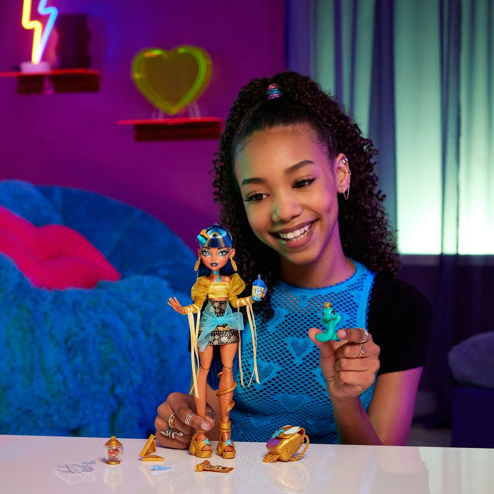 Monster High Cleo De Nile doll looks royally radiant in a gore-geous outfit! She comes with her pet cobra Hissette, as well as accessories fit for a pharoah. This mummy's style is pure gold! Cleo De Nile wears a shimmery blouse with mummy wrap ribbon fringe on the sleeves. A layered hieroglyph skirt, snake leg cuff and scarab sandals complete her lurk!