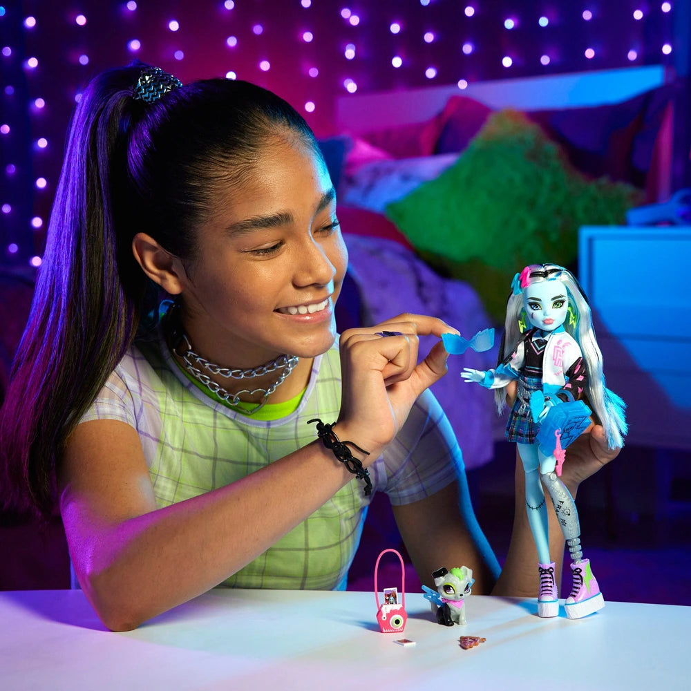Frankie Stein doll struts down the Monster High hallways in an electrifying fashion featuring a plaid skirt, lightning bolt-printed blouse and stitch-detailed vest. Their freaky-fabulous look is complete with chunky platform sneakers, creeperific accessories and a prosthetic leg and stitch details celebrating their unique style. Take Frankie Stein doll's look to the next level with a voltageous varsity jacket and electrifying accessories. Plus, inspire spooktacular storytelling with their creepy-cute pet dog, Watzie!