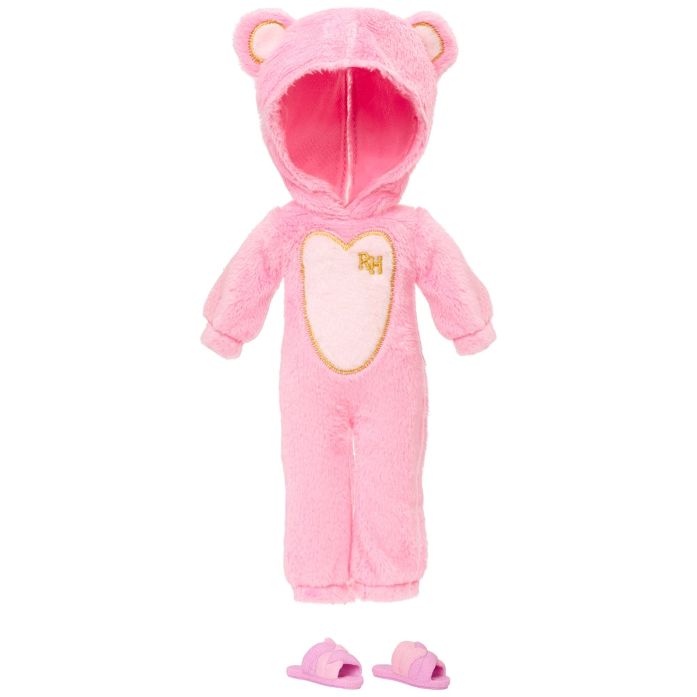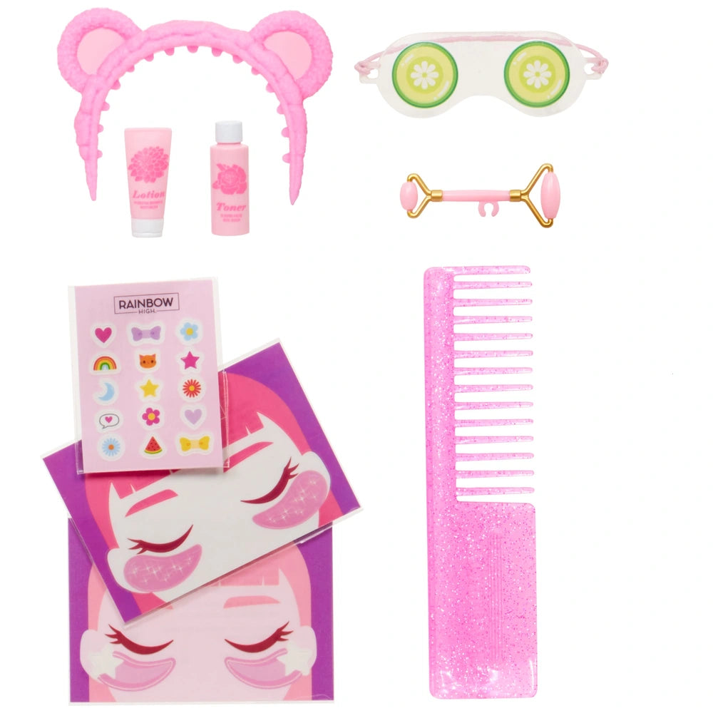 Contents: 1x fashion doll, 1x plush onesie, 1x pink slippers, 1x headband, 1x eyewear, 3x beauty accessories, 1x comb & 3x sticker sheets