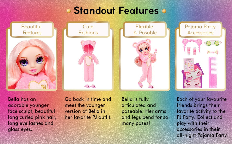 With a pink design and lots of matching accessories, this Junior High Bella doll is ready for any sleepover party, play date or school trip. In fact, all the Junior High fashion dolls are getting ready for an exciting slumber party (each sold separately)! Chat all night long with your best friends, laugh, listen to music and take part in the perfect overnight beauty program.