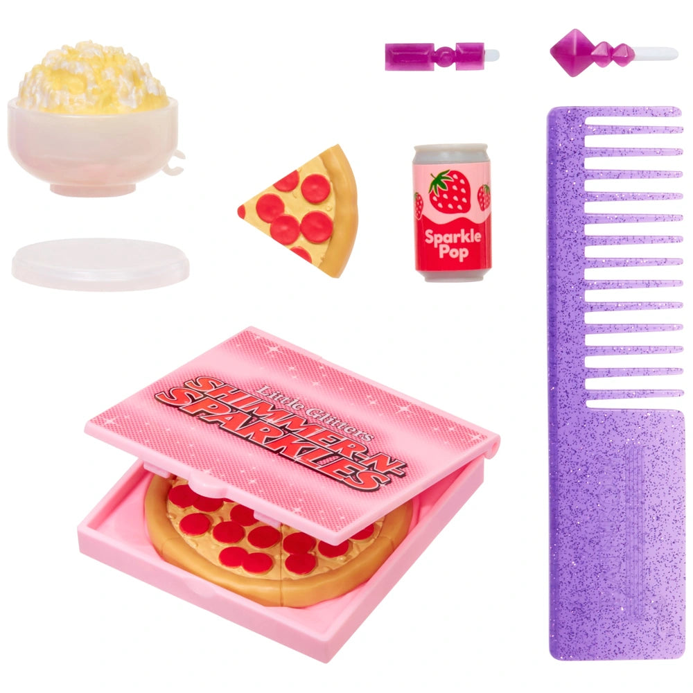 Contents: 1x Violet doll, 1x tshirt, 1x pants, 1x pair of shoes, 1x pizza, 1x pizza box, 1x plate, 1x can of soft drink, 1x bowl of popcorn, 2x hair clips, 1x comb