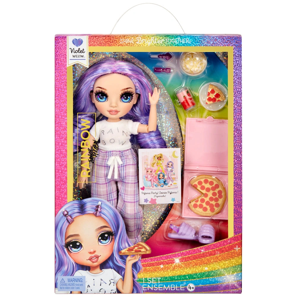 With her signature purple design and lots of matching accessories, this Junior High Violet doll is ready for any sleepover party, play date or school trip. In fact, all the Junior High fashion dolls are getting ready for an exciting slumber party (each sold separately)! Chat all night long with your best friends, and snack on popcorn and pizza!