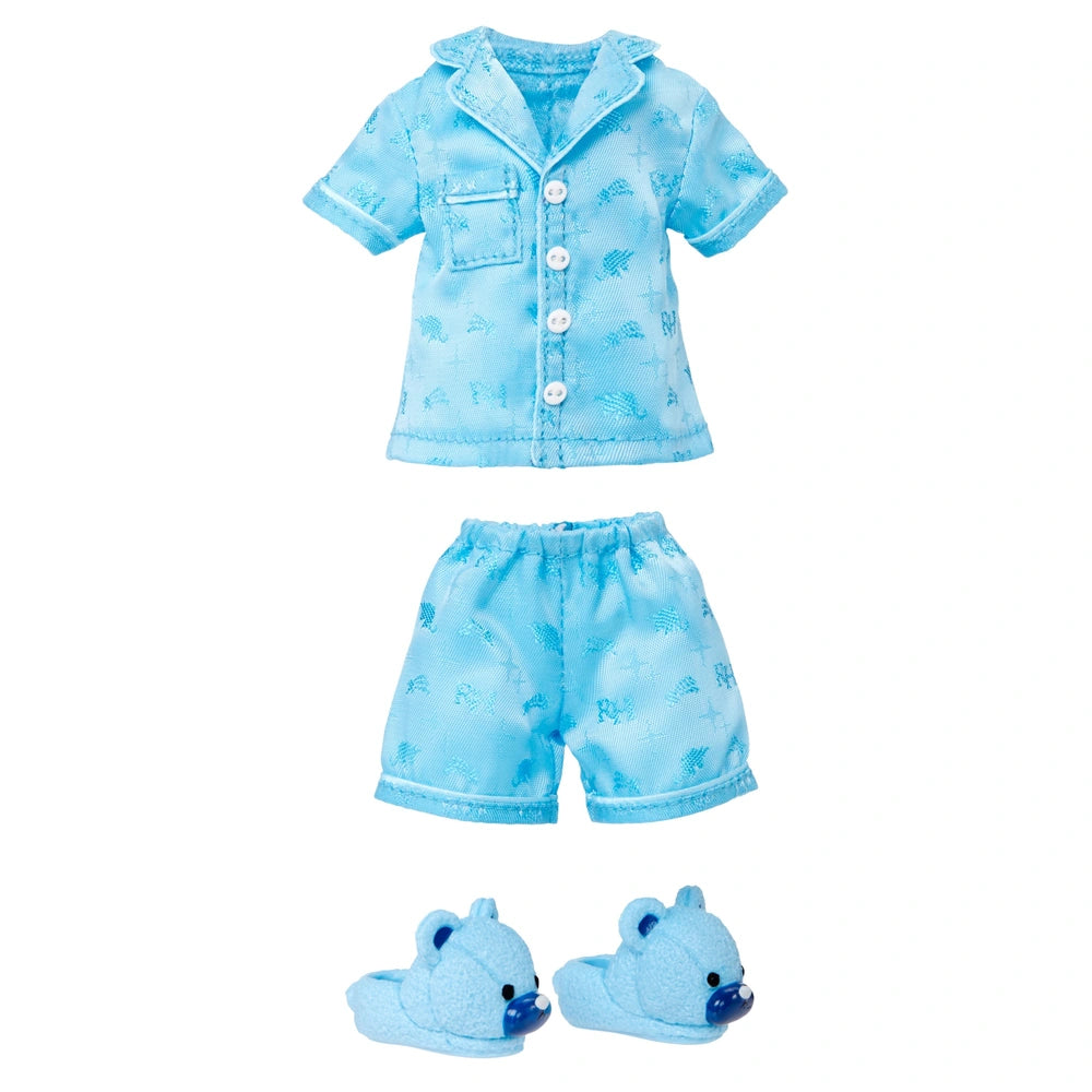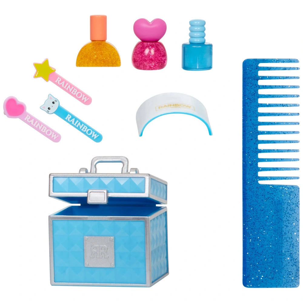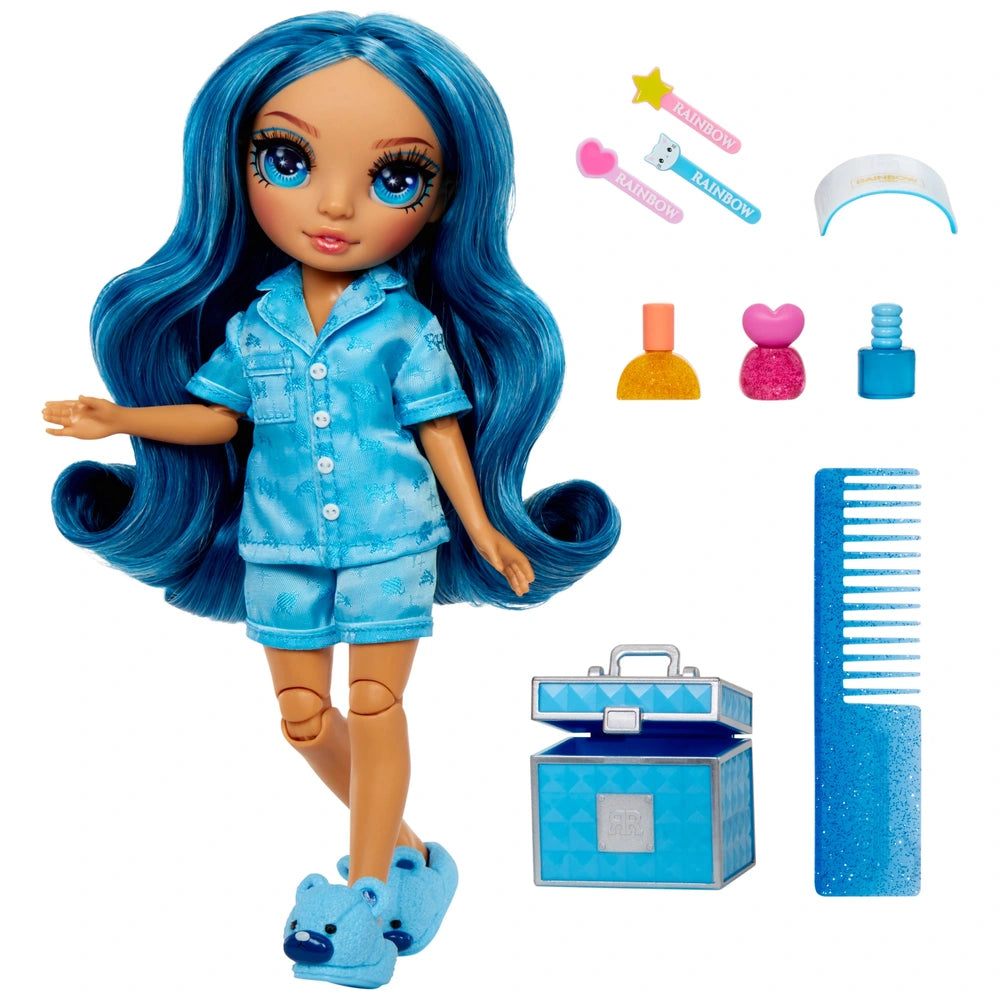 Contents: 1x fashion doll, 1x PJ top, 1x PJ shorts, 1x blue slippers, 1x beauty case, 1x eyewear, 6x beauty accessories & 1x comb