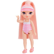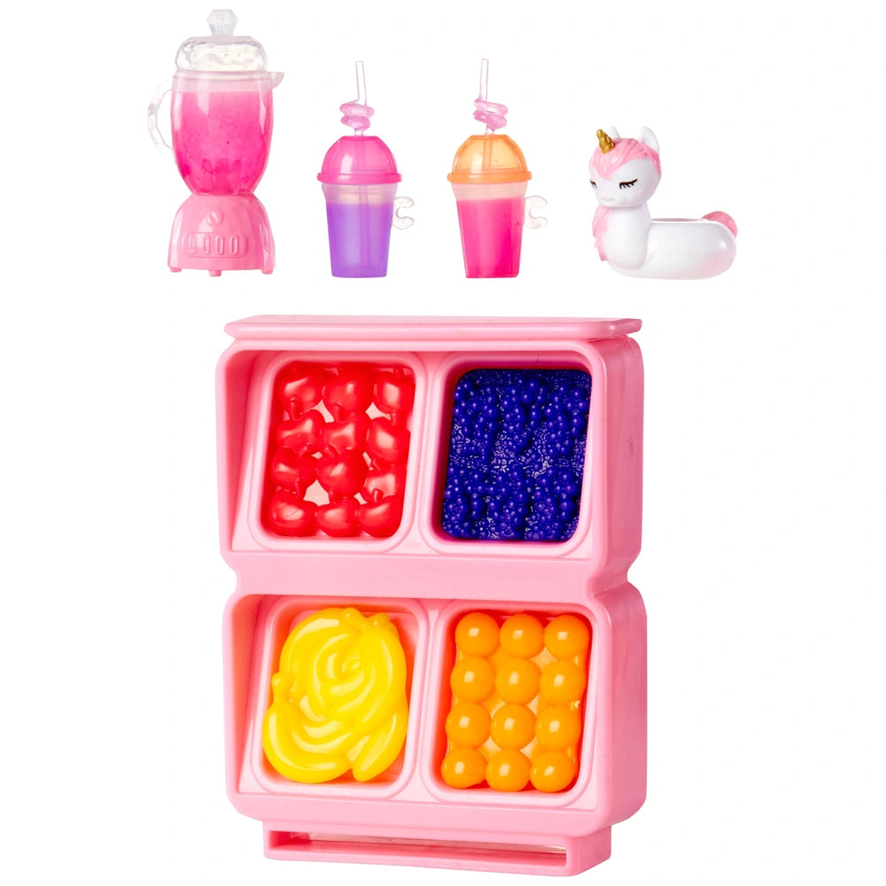 Blush isn't just about the pool, she can whip up delicious treats at her smoothie stand, complete with a blender, fruits, and juice cups. Poolside accessories like a unicorn drink floatie, popsicle, goggles, and a fan add extra flair, while sunscreen protects Blush while she relaxes poolside.