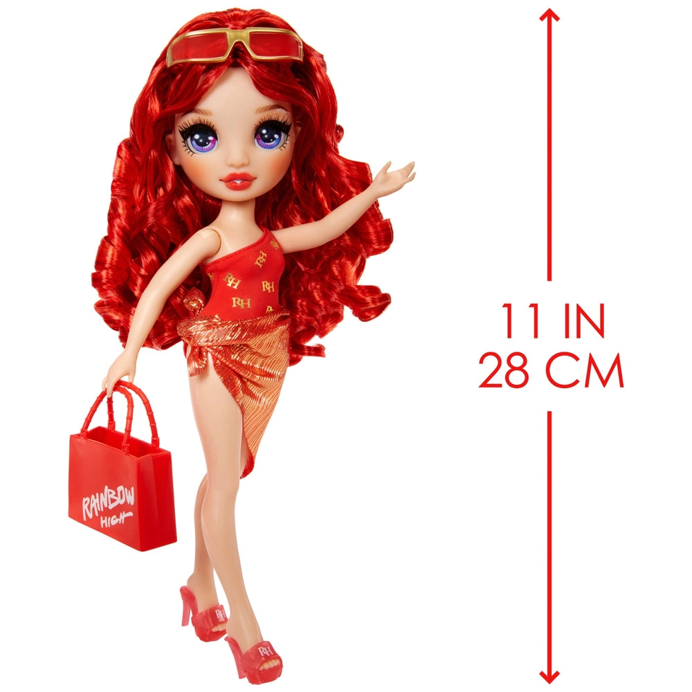 Ruby is ready for a day of fun with friends in her adorable red one- shoulder swimsuit, matching red sandals, sunglasses, and handbag. The new, Rainbow High Swim & Style Ruby Fashion Doll comes with a fashionable red wrap that can be styled in over 10 different ways: swimsuit cover up, skirt, dress, superhero cape, accessory scarf, towel and so many more!