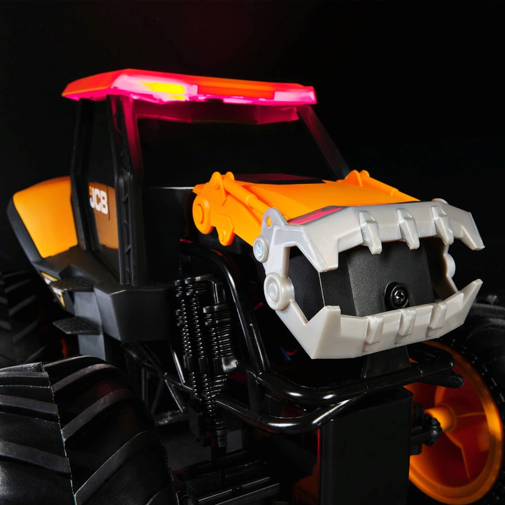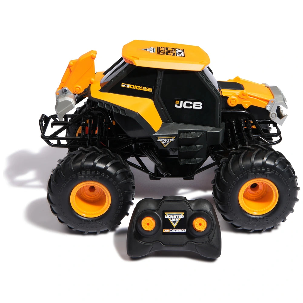 Race into Monster Jam action with this official remote control JCB Digatron! This 1:15 scale monster truck is ready to roll right out of the box, featuring a full-function dual joystick remote control, authentic details, excavator bucket, LED lights, and soft oversized rubber tyres to pull off epic stunts with ease!