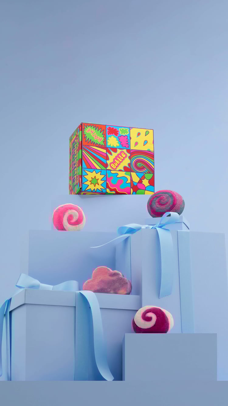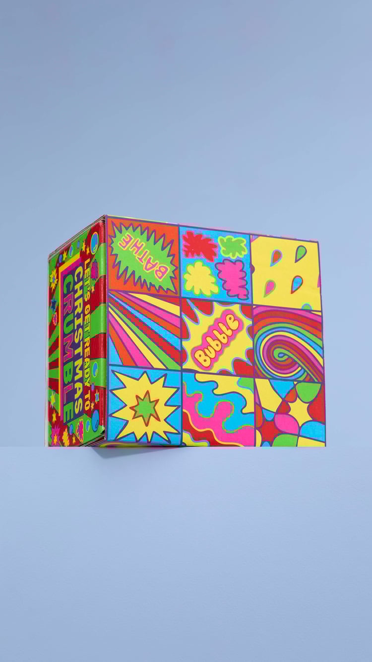 Lush Creative Artworker Georgia Haywood, says, “This gift design was inspired by the bold colours, iconic motifs and punchy patterns of the Pop Art movement, blended with the playful themes of bubbles and festive bath time fun.”
