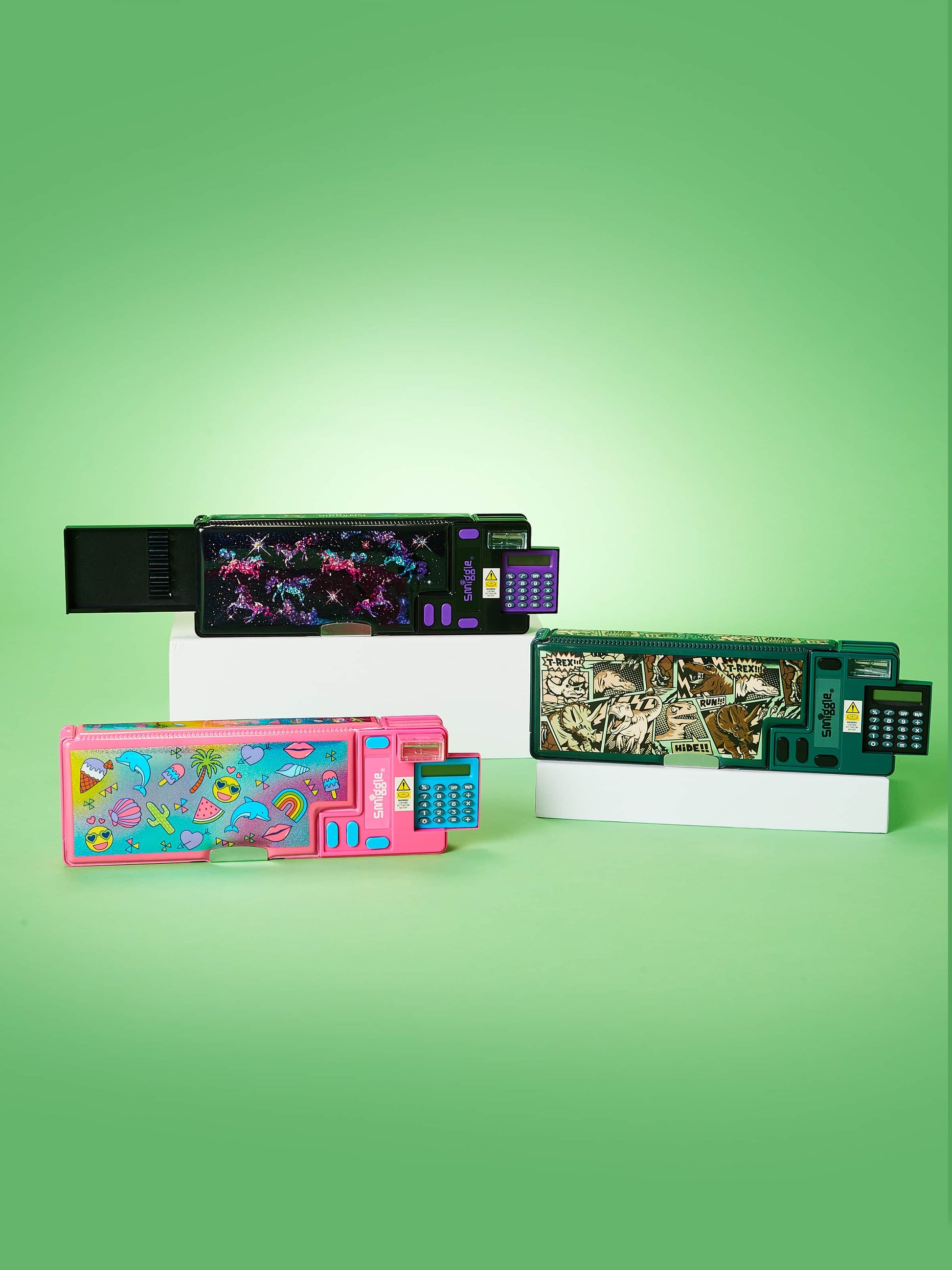 Stash stationery away in our Wonder World Pop Out Pencil Case. Press the interactive buttons to reveal secret stationery surprises including a calculator, sharpener and more! Plus, check out the totally fun reflective front!